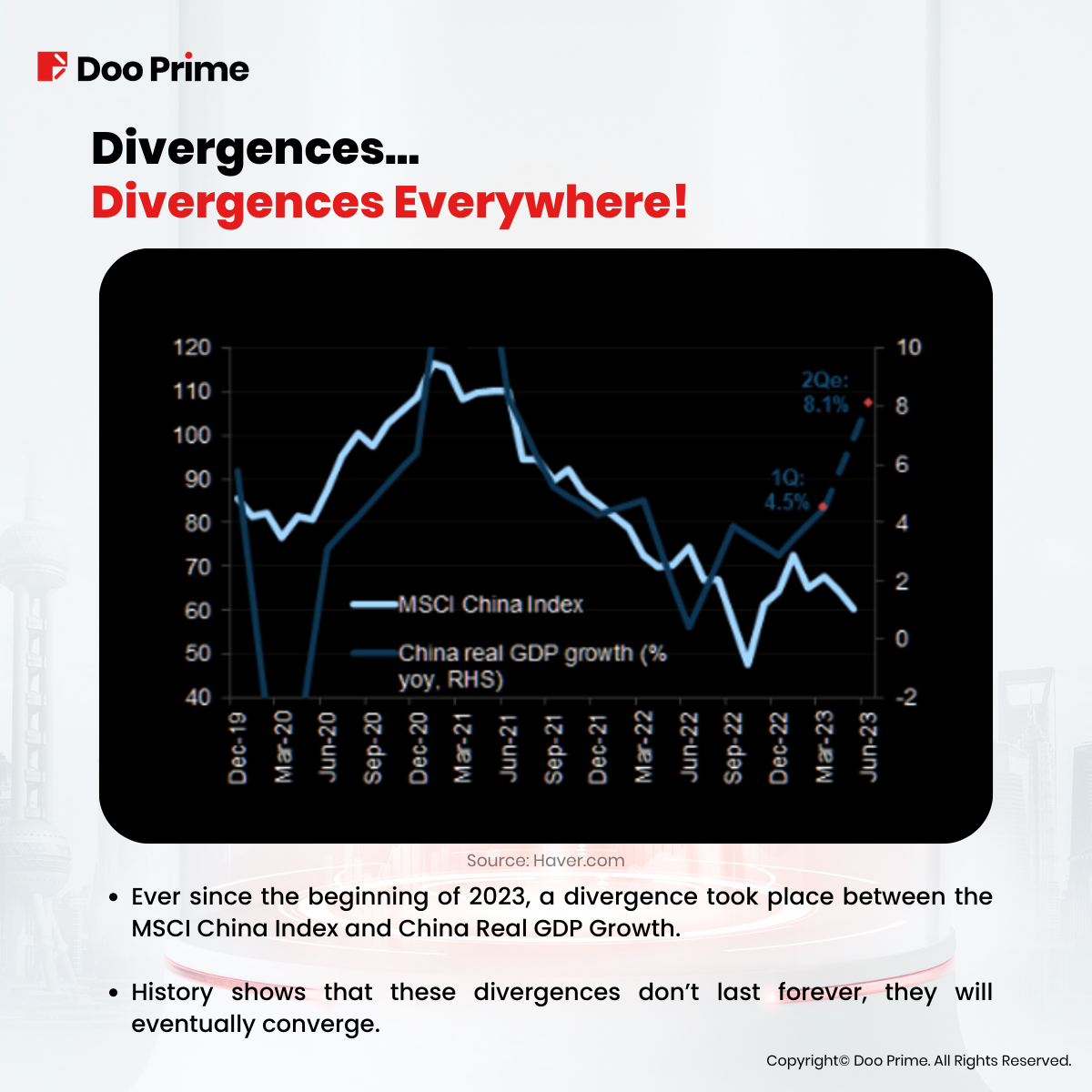 Goldman Sachs also shares the same sentiment with this forecast, revising their own projection to 6%. If these economic figures materialize and the GDP goes to higher levels, it could instill a renewed sense of confidence among investors in the China market. As a result, this will potentially lead the MSCI China Index to regain momentum and catch up with the GDP growth.