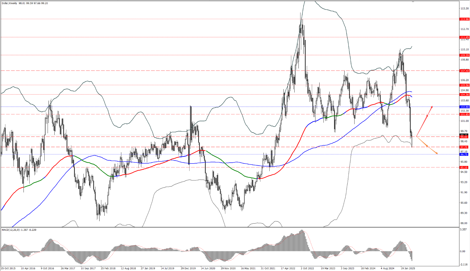 - 이번 주에도 99선에서의 다소 불확실한 변동을 주의 깊게 살펴야 합니다. 만약 달러 지수가 99선 근처에서 안정세를 보이며 반등한다면 101.85와 102.80 두 저항선에 주목해야 합니다.