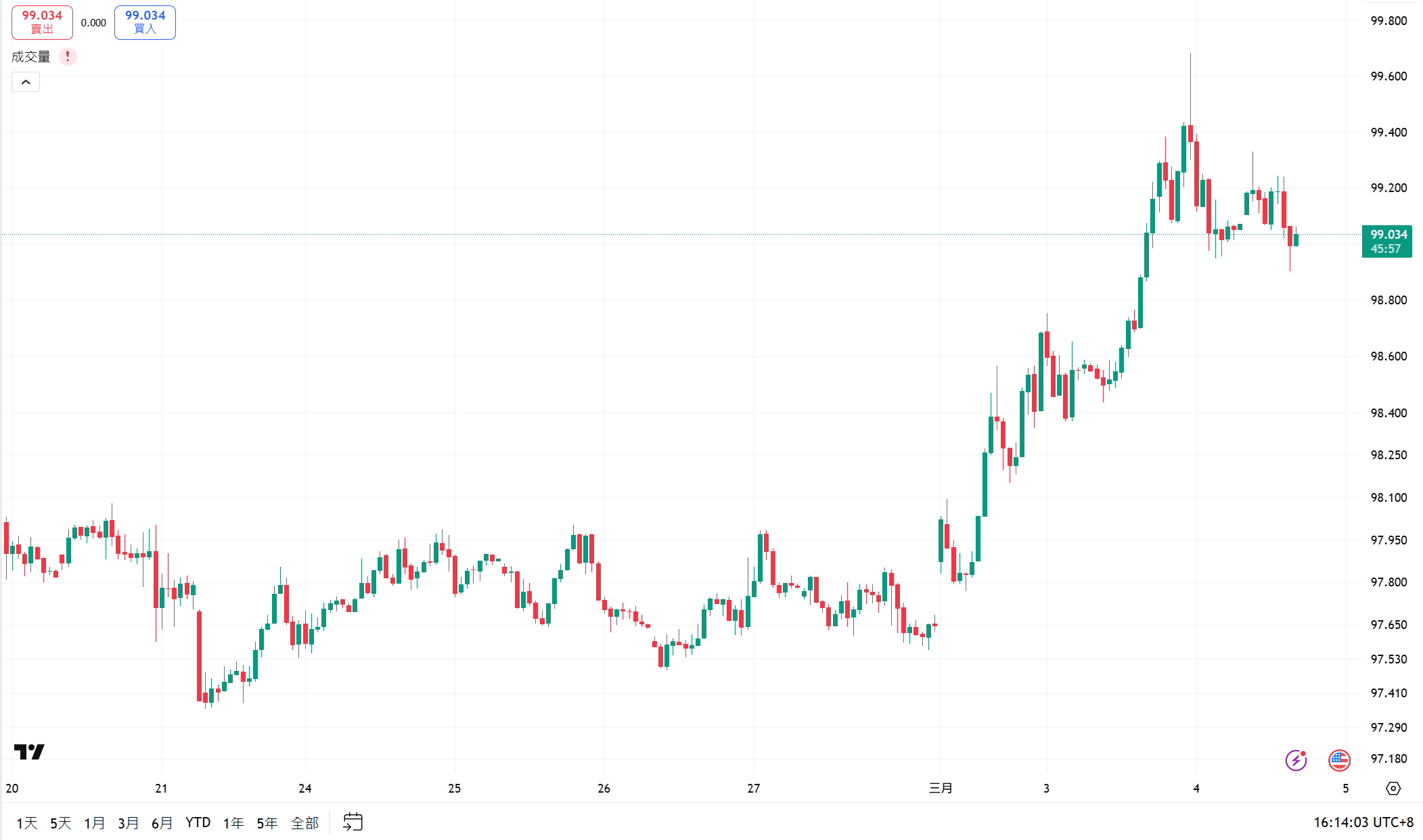 再通俗点说,就是美元在战争中反而更受欢迎了,大家抛售黄金、日元去买入美元、美债。难怪这几天美元指数如此强势。