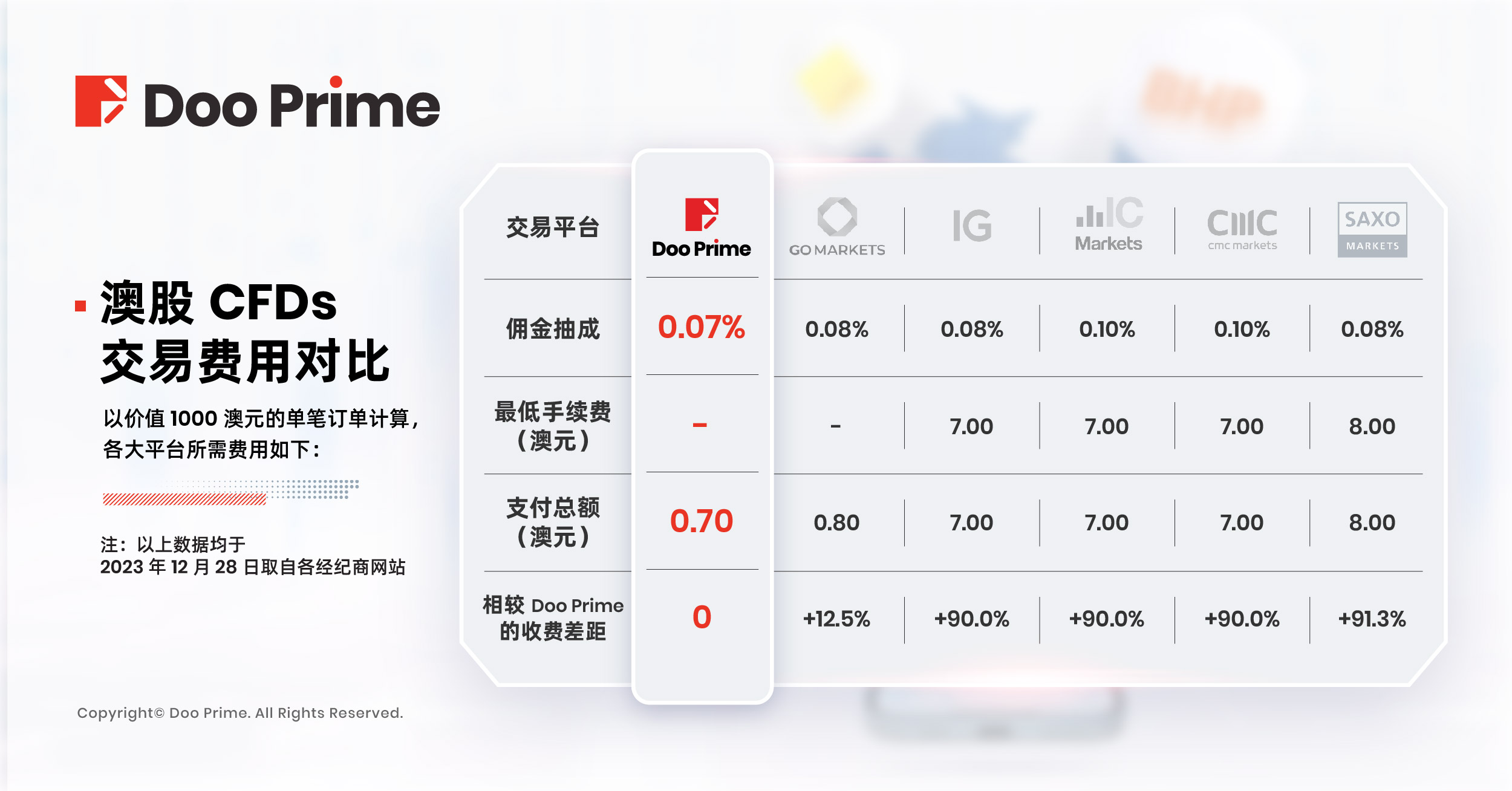 换言之,在 Doo Prime MT5 交易 1,000 澳元的澳股 CFDs,投资者总共只需支付 0.70 澳元的手续费,相较于其他平台,可节省高达 91.3% 的费用!