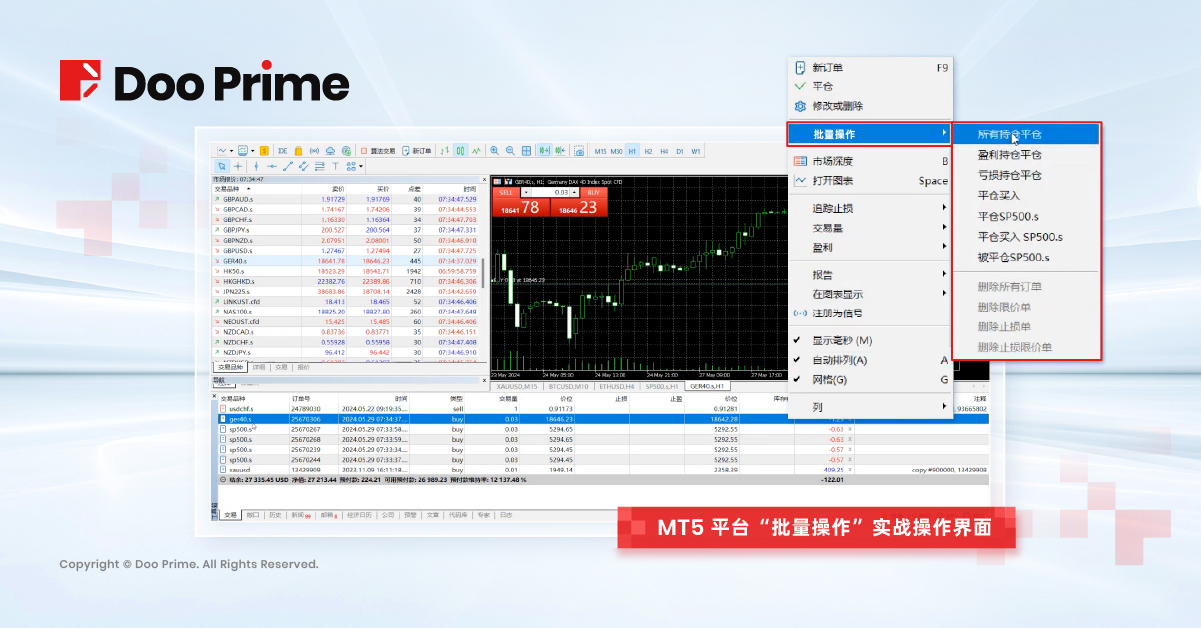 MT5 的这一功能极大地提高了操作效率,尤其在市场剧烈波动时,能够及时锁定利润或减少损失,避免手动逐一平仓所带来的延迟和错误。通过这种方式,交易者可以更快、更准确地响应市场变化,保护自己的投资。