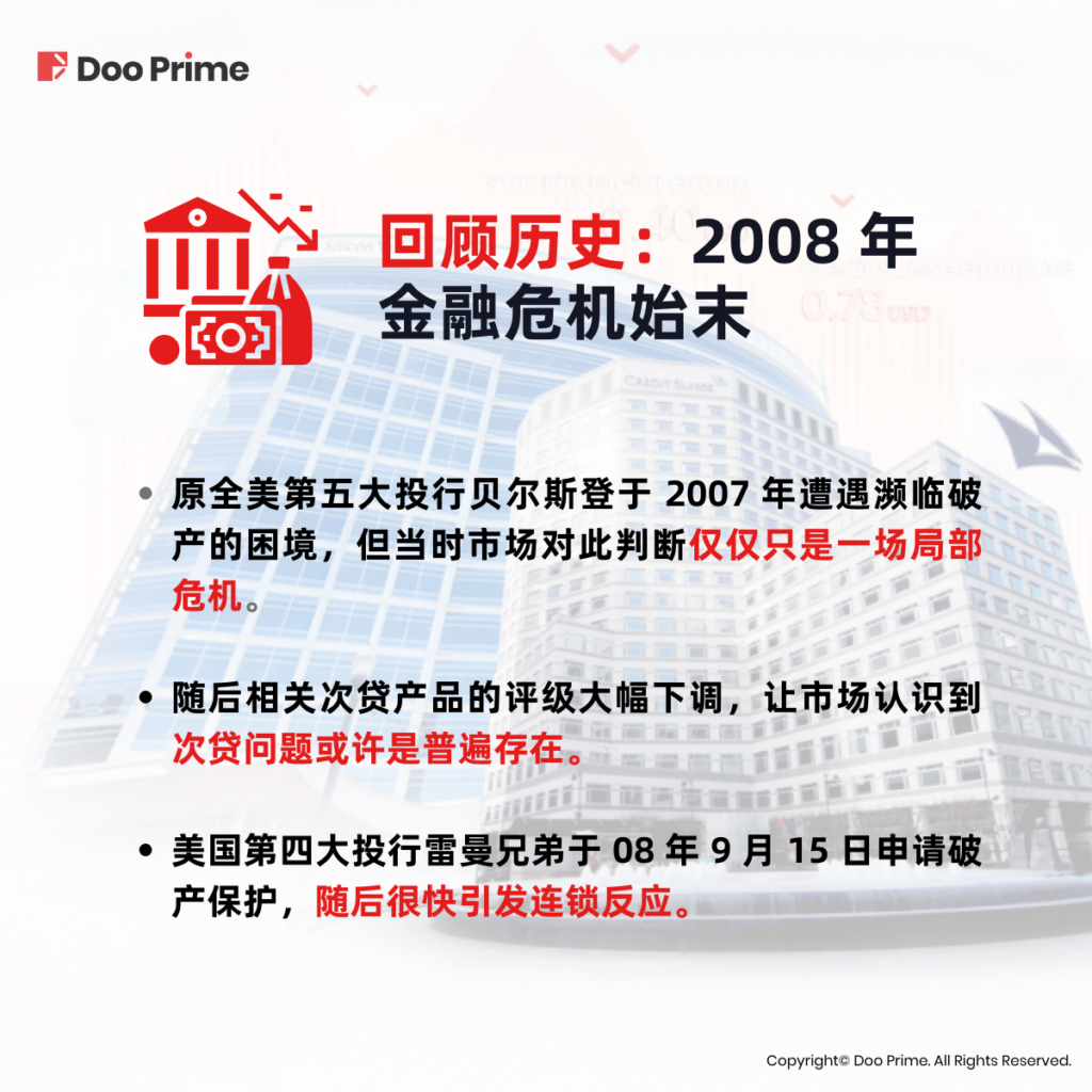 随着各大银行频繁被曝遭遇流动性危机,近来的银行业已然是风声鹤唳,整体行业股价也不断走低。这一切都不禁令人们联想起 15 年前那场波及全球的金融危机,如今的 SVB 和瑞信会像曾经 2008 年的贝尔斯登和雷曼那样成为新一轮金融危机的导火索吗?本文就将以史为鉴,带您通过现象观察本质,从而探究金融危机是否将再度降临。