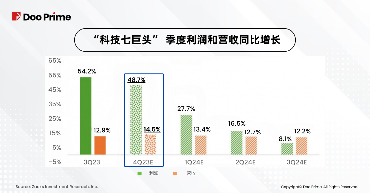 “科技七巨头” 占标准普尔 500 指数总市值的 28.6%,预计 2024 年对该指数总收益贡献 19.5%。在 2023 年第四季度,“科技七巨头” 的权重越来越大,占了标普 500 指数所有收益的 23.1%。