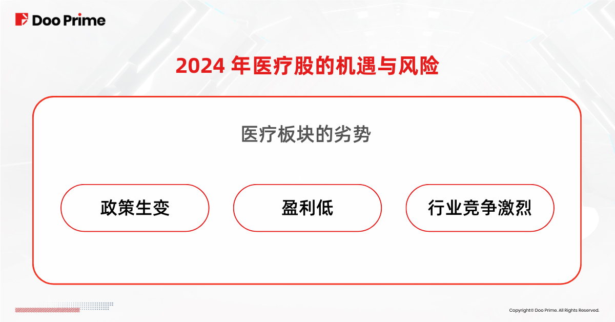 在 2024 年,股市中的医疗板块预计将趁着减肥药和 AI 的热潮进一步上涨。由于目前医疗股估值偏低,而且发展空间巨大,叠加医疗股本身波动性低的特质,对投资者而言,将会是防御性股票的最佳选择之一。然而,投资者需要意识到,凡事都有一体两面,应密切留意美国大选之年的医疗政策是否会生变,而且在行业竞争激烈的情况下,医疗企业能否存活,并实现盈利。