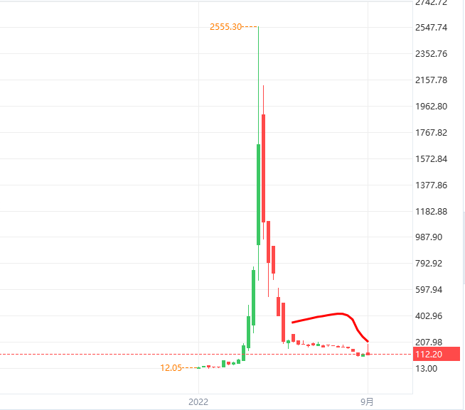 随后的几个交易日,该股持续下跌,截至 9 月 1 日收盘已回落至 5.5 美元/股,较上市首日 186.01 美元的最高价,已下跌 97%。