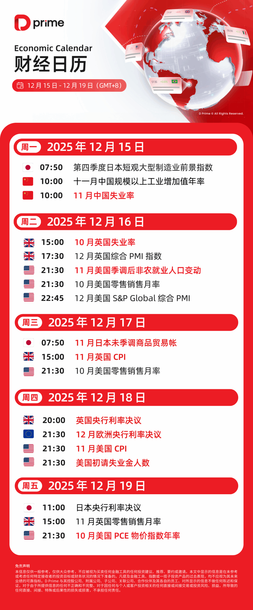 财经日历 | 以下为 2025 年 12 月 15 日至 2025 年 12 月 19 日(GMT+8 北京时间) 全球重大经济事件提醒。在重大行情期间,请确保您已审查您的保证金率,并有足够的保证金来支撑您的风险敞口。
