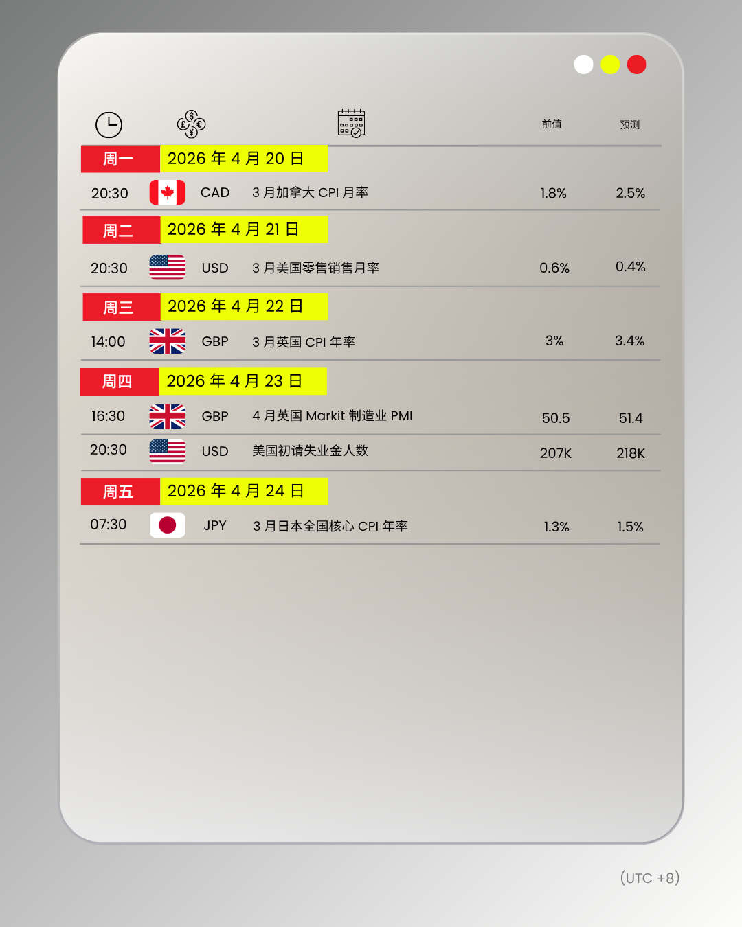 财经日历 | 以下为 2026 年 4 月 20 日至 2026 年 4 月 24 日(GMT+8 北京时间) 全球重大经济事件提醒。在重大行情期间,请确保您已审查您的保证金率,并有足够的保证金来支撑您的风险敞口。