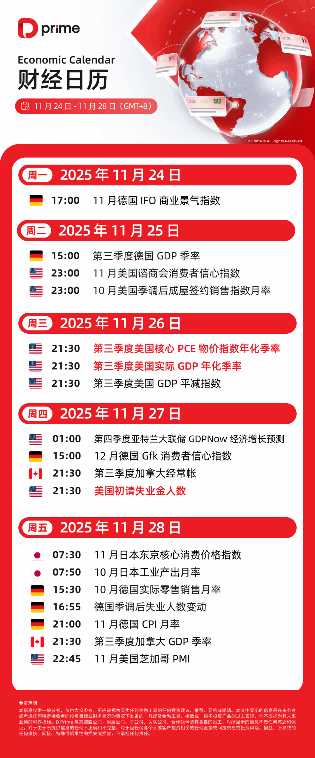 财经日历 | 以下为 2025 年 11 月 24 日至 2025 年 11 月 28 日(GMT+8 北京时间) 全球重大经济事件提醒。在重大行情期间,请确保您已审查您的保证金率,并有足够的保证金来支撑您的风险敞口。
