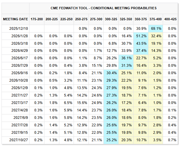 纪要还指出,一些成员警告人工智能(AI)题材估值过高,可能引发金融市场无序调整;多数决策者支持自 12 月起暂停资产负债表缩减(缩表),以缓解流动性压力。会后,主席鲍威尔强调 12 月降息“并非板上钉钉”,而政府停摆导致就业数据延迟公布,也使市场对进一步降息的预期有所降温。