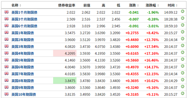 此外,两年期英债收益率大涨 35.55 个基点,逼近 4% 关口,录得 2009 年 11 月以来最大单日涨幅;10 年期英债收益率涨 33.70 个基点至 3.832%,续刷 2010 年以来新高。