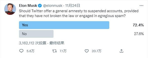 马斯克还解封了美国前总统特朗普( Donald Trump )的推特账户,并打算“特赦”更多遭推特封禁的账户。当地时间 11 月 23 日,马斯克再次发起网友民意调查,询问是否应该让大多数被封禁的推特账户“回归”,24 小时后的投票结果显示,超 300 万网友参与投票,72.4% 的受访者投了赞成票。