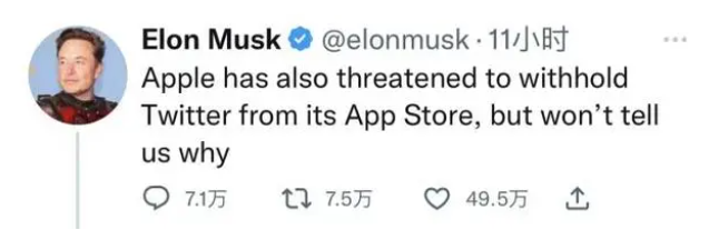 马斯克表示,苹果公司已基本停止在推特上投放广告,并质疑了其内容审查制度和垄断行为。他透露,“苹果威胁要从应用商店中下架推特,但没有告诉我们下架的原因。”