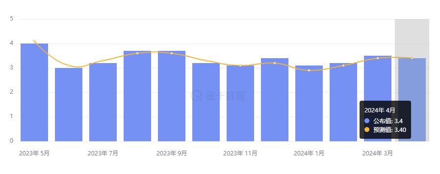 美国劳工统计局公布,4 月 CPI 同比增长 3.4%,持平预期,较前值 3.5% 小幅下降;环比增长 0.3%,低于预期和前值 0.4%。