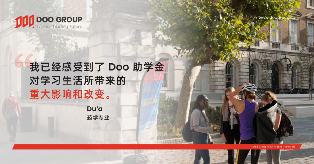 Doo 助学金由 Doo Group 于 2021 年在伦敦国王学院设立,旨在为经济困难的学生提供为期三年的资助。伦敦国王学院是英国排名前六的知名院校之一,我们希望这项助学金能够助力青年学子圆梦大学。