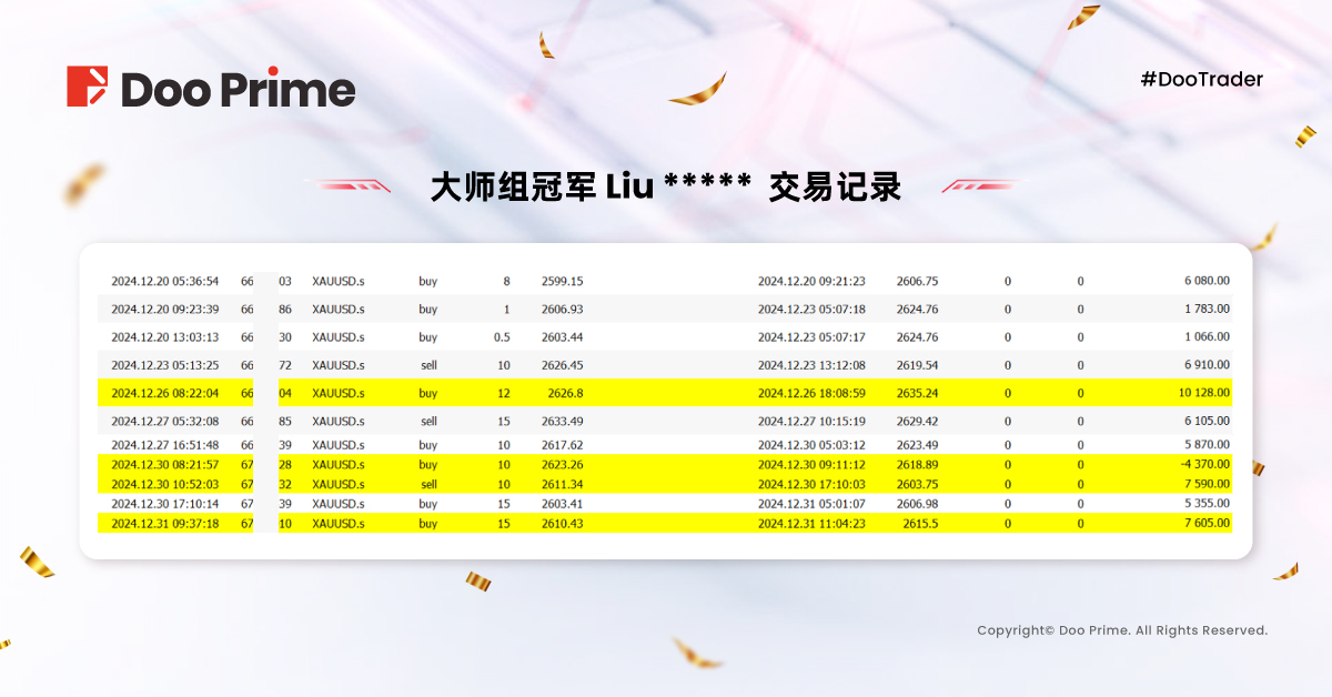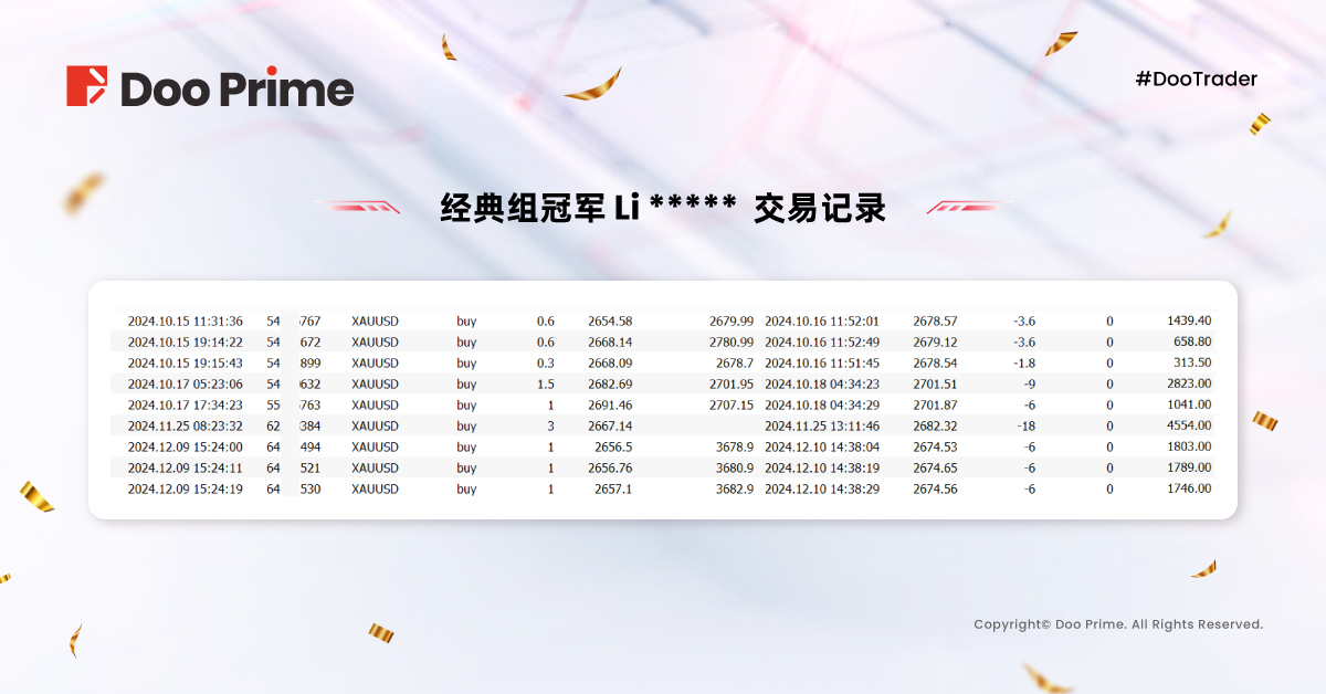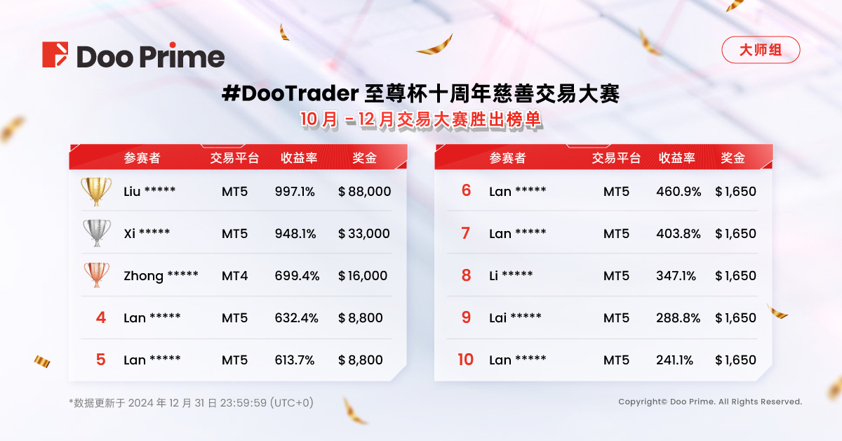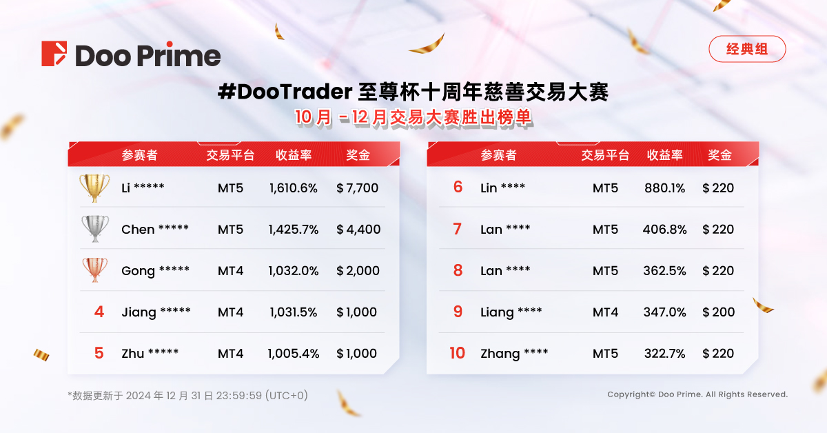 #DooTrader 十周年至尊杯已圆满落幕!在这个瞬息万变的交易世界中,Doo Prime 将始终与您并肩前行,敬请期待 2025 年更加精彩的全新赛事,与您共同书写新的辉煌篇章。