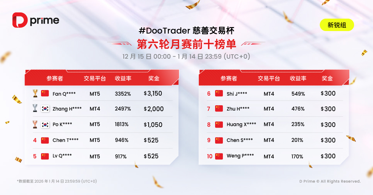 D Prime #DooTrader 慈善交易杯第六轮月赛已于 1 月 14 日 23:59(UTC+0)顺利落幕,赛果榜单火热揭晓!历经半年的鏖战,六轮月赛圆满收官,赛事正式迈入岛屿争霸赛决赛阶段!
