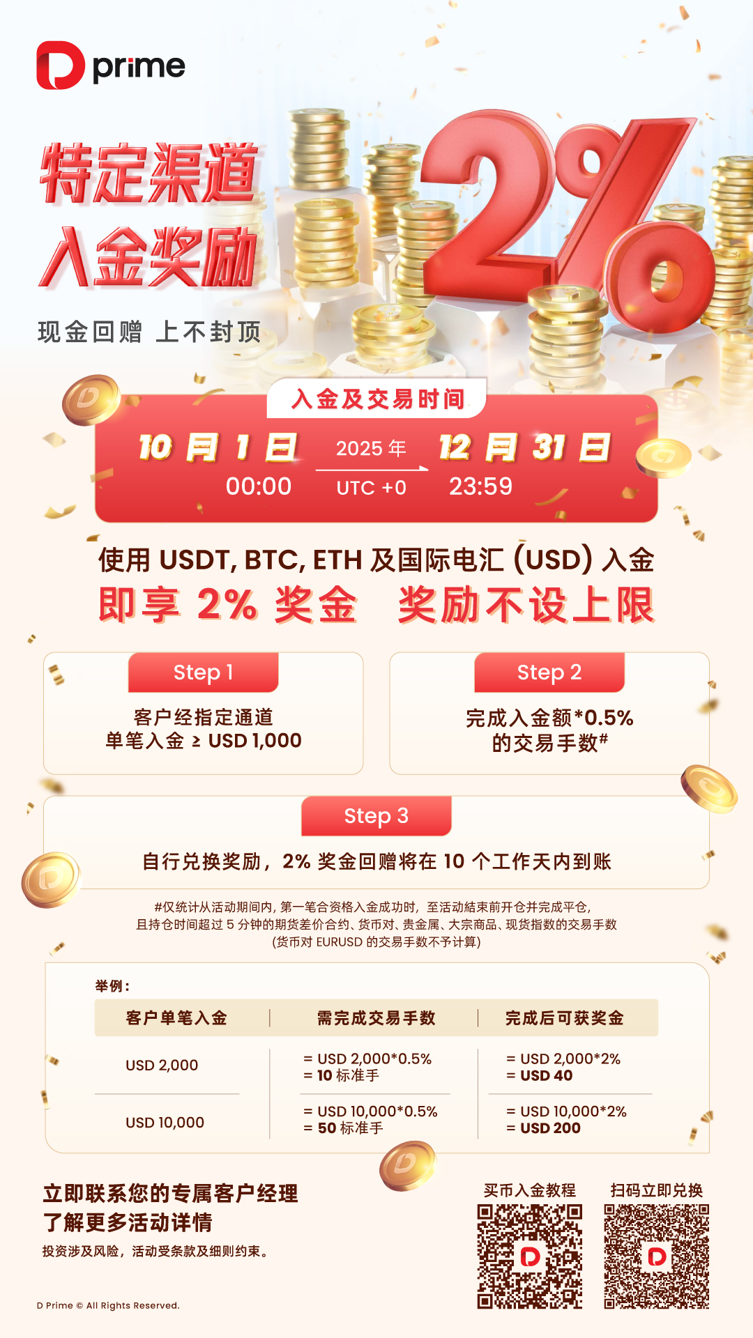 D Prime 延续广受好评的入金回馈活动,您只需通过 USDT 或国际电汇(USD)等指定渠道入金,即可享受高达 2% 的现金回赠,奖励无上限!助您灵活配置资金,高效把握年末市场机遇,让财富在节日氛围中持续增值。