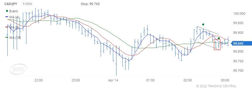 On 2022 Apr 14 at 02:25 GMT, the 4-bar Moving Average crossed above the 9-bar MA which crossed above the 18-bar MA, signaling a new uptrend has been established.