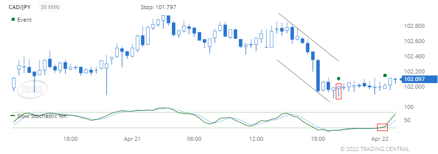 A bullish event triggered for Slow Stochastics on 2022 Apr 22 at 00:30 GMT when the %K line crossed above the %D line. The close prices are trading closer to the upper end of the recent high-low price range, which is associated with price increases.