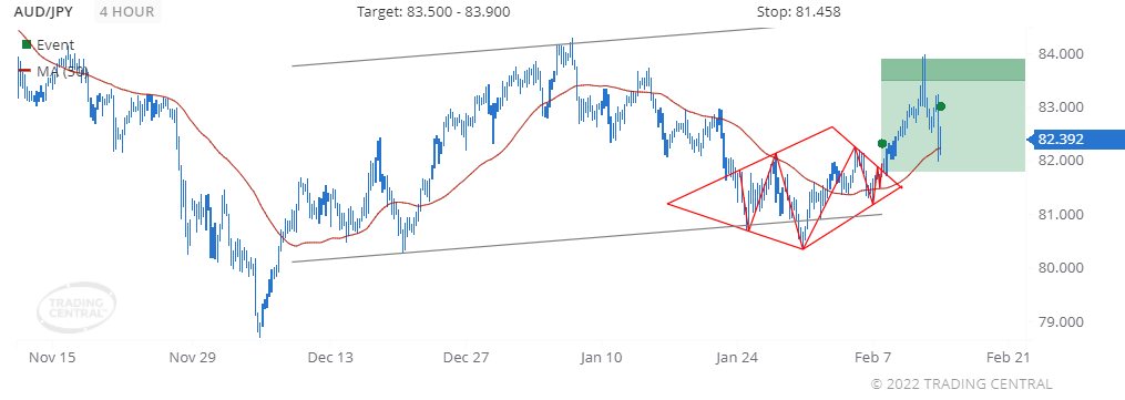We found a pattern called Continuation Diamond (Bullish) on 2022 Feb 07 at 17:00 GMT on a 4 hour chart, providing a target price for up to 2 weeks in the range of 83.500 to 83.900.