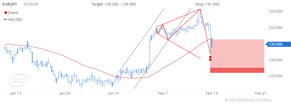 We found a pattern called Megaphone Top on 2022 Feb 11 at 21:00 GMT on a 4 hour chart, providing a target price for up to 2 weeks in the range of 129.200 to 129.500.