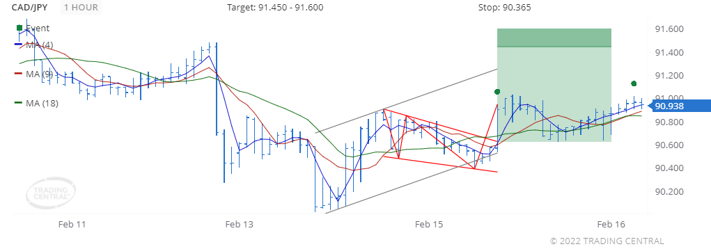 We found a pattern called Flag (Bullish) on 2022 Feb 15 at 09:00 GMT on a 1 hour chart, providing a target price for up to 48 hours in the range of 91.450 to 91.600.