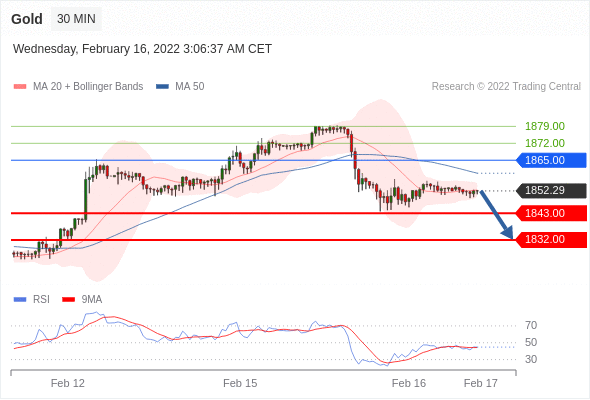 As long as the resistance at 1865.00 is not surpassed, the risk of the break below 1843.00 remains high.
