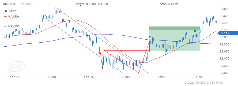 We found a pattern called Double Bottom on 2022 Feb 24 at 19:45 GMT on a 15 minute chart, providing a target price for up to 48 hours in the range of 83.200 to 83.300.