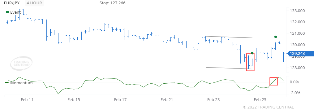 The Momentum oscillator crossed above 0 on 2022 Feb 25 at 17:00 GMT, thereby signaling a new accelerating uptrend.