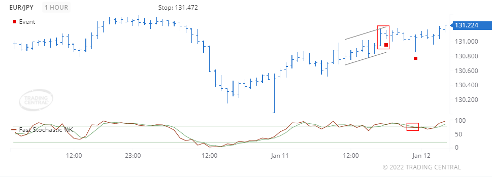 A bearish event triggered for Fast Stochastics on 2022 Jan 11 at 23:00 GMT when the %K line crossed below the %D line. The close prices are trading closer to the lower end of the recent high-low price range, which is associated with price decreases.