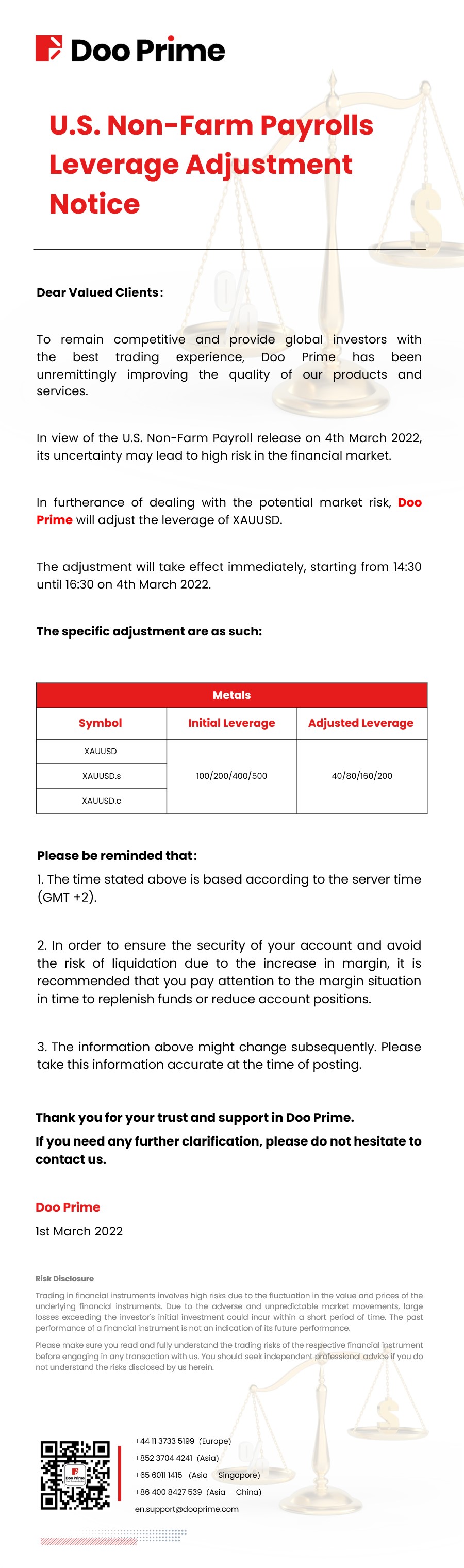 2022-03-01 | Leverage Adjustment Notice , U.S. Non-Farm Payrolls Leverage Adjustment