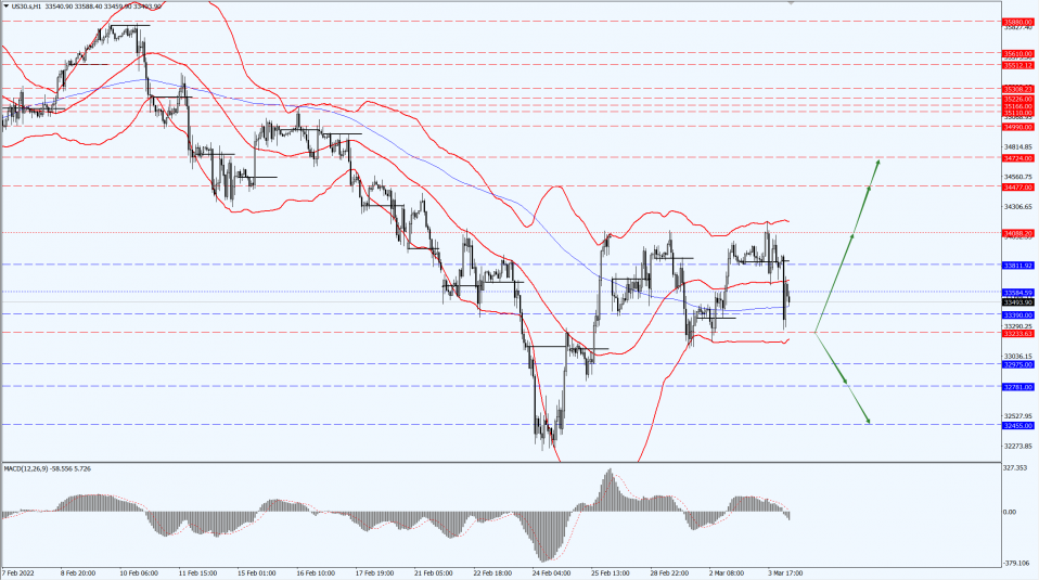 The Dow focuses on the 33233-line today. If the Dow runs stably above the 33233-line, then pay attention to the suppression of the 34088 and 34477 positions. If the Dow breaks below the 33233-line, it will pay attention to the support strength of the 32781 and 32455 positions.