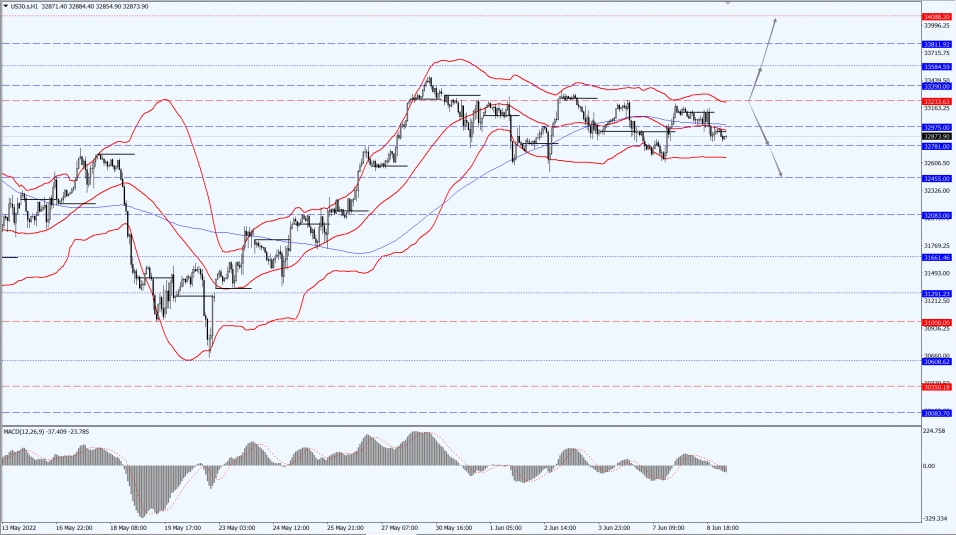 The Dow focuses on the 33233 line today. If the Dow runs stably above the 33233-line, it will pay attention to the suppression strength of the 33584 and 34088 positions. If the Dow falls below the 33233-line, then pay attention to the support strength of the 32781 and 32455 positions.
