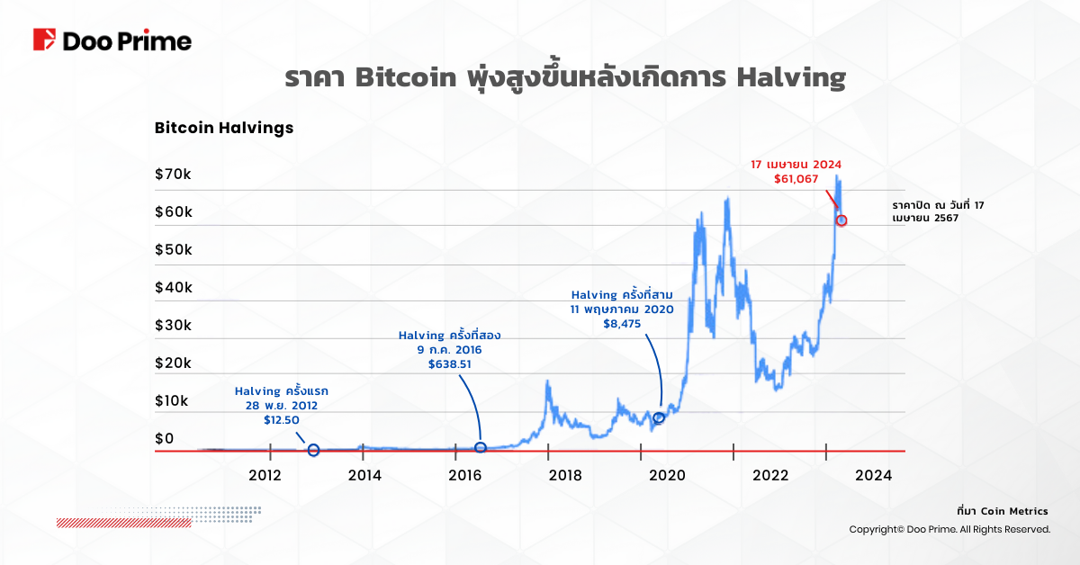 ข้อมูลในอดีตเผยให้เห็นแนวโน้มที่น่าสนใจ คือ ราคา Bitcoin มีแนวโน้มที่จะพุ่งสูงขึ้นหลังจากเหตุการณ์ Halving เราสามารถเห็นได้อย่างชัดเจนในแผนภูมิด้านบน ซึ่งแสดงให้เห็นถึงราคาที่เพิ่มขึ้นอย่างน่าตกตะลึงหลังจาก Bitcoin Halving แต่ละรอบ แม้ตอนแรกราคาจะดูนิ่ง แต่มูลค่าของ Bitcoin ก็เพิ่มขึ้นอย่างต่อเนื่องในช่วงหลายเดือนและหลายปีหลังจากเหตุการณ์ Bitcoin Halving ซึ่งตอกย้ำสถานะของ Bitcoin ในฐานะแหล่งเก็บมูลค่าและสินทรัพย์การลงทุน