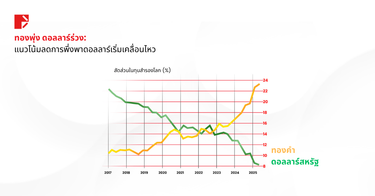 กราฟข้างต้นเผยให้เห็นเรื่องใหญ่กว่าที่ตาเห็น: ทุนสำรองทั่วโลกกำลังเปลี่ยนขั้ว สัดส่วนทองคำพุ่งขึ้นอย่างรวดเร็ว ขณะที่ดอลลาร์ดิ่งลงอย่างหนัก ธนาคารกลางหลายแห่งกำลังกระจายความเสี่ยง ไม่ใช่แค่เพื่อผลตอบแทน แต่เพื่อความปลอดภัยจากความผันผวนของสกุลเงินดอลลาร์
