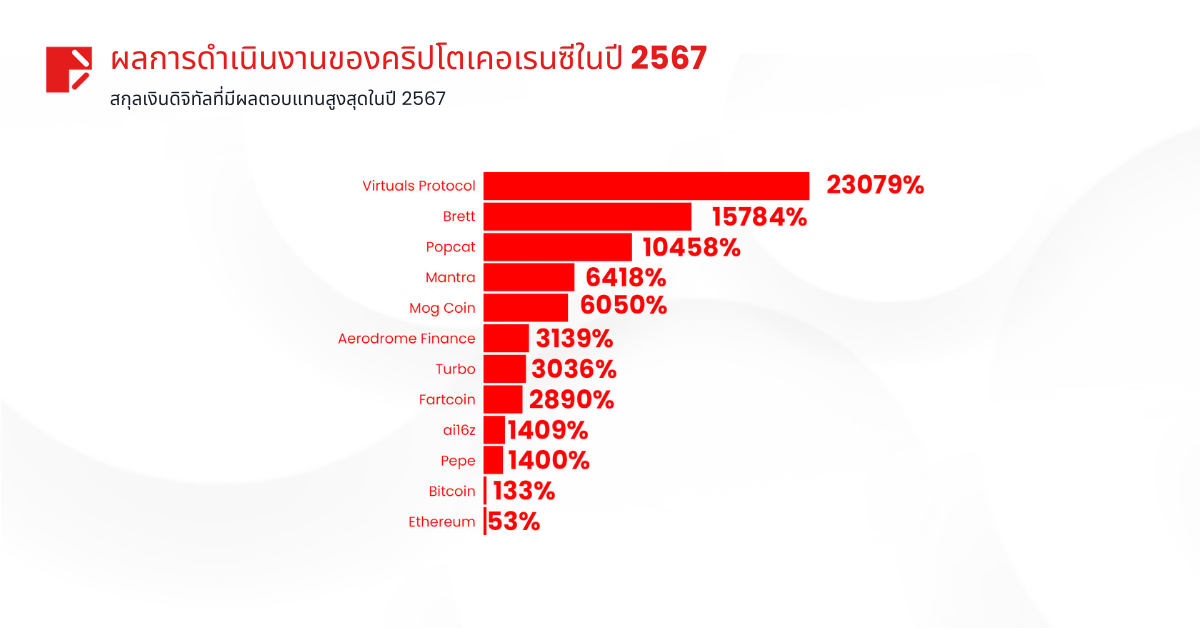 โทเคน $VIRTUAL ให้ผลตอบแทนราคาสูงสุดถึง 23,079.2% โดยเริ่มต้นปีที่ราคา $0.01311 และพุ่งขึ้นถึง $3.04 ในวันที่ 25 ธันวาคม ตำแหน่งอื่น ๆที่ได้รับกำไรสูงสุดส่วนใหญ่เป็นของเหรียญมีม เช่น Brett, Popcat, Turbo, Fartcoin, ai16z และ Pepe