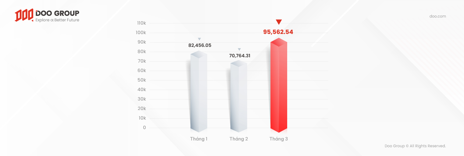 Theo như báo cáo, tổng khối lượng giao dịch của Doo Prime trong tháng 03 năm 2024 được ghi nhận ở mức 95.56 tỷ USD, tăng 35.04% so với tháng trước. Đáng chú ý, khối lượng giao dịch trung bình hàng ngày (ADV) trong tháng 03 đạt mốc 3.08 tỷ USD, tăng 26.33% so với hồi tháng 2.