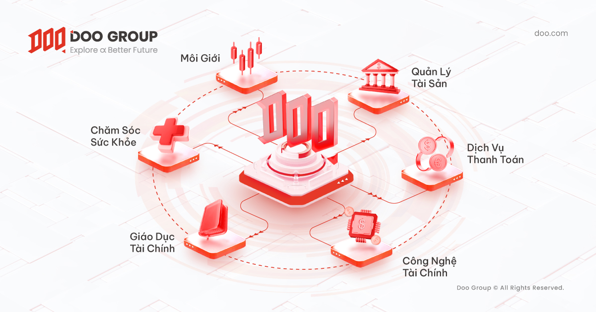 Các chi nhánh kinh doanh của chúng tôi cũng đã mở rộng và tập trung trên 6 lĩnh vực cốt lõi: Môi Giới, Quản Lý Tài Sản, Dịch Vụ Thanh Toán, FinTech (Công Nghệ Tài Chính), và Chăm Sóc Sức Khỏe. Hiện tại, Tập đoàn Doo Group đã sở hữu hàng loạt các thương hiệu khác nhau, trong đó bao gồm: