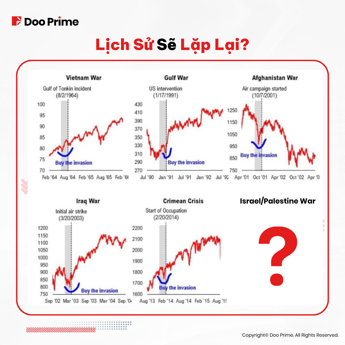 Ngược lại với các quan niệm thông thường, lịch sử đã chỉ ra rằng chiến tranh có thể tạo ra những ảnh hưởng tích cực đến thị trường. Cụ thể, khi chiến tranh xảy ra, thị trường thường phản ứng tăng không lâu sau đó. Bạn có thể thấy được mẫu hình này trong biểu đồ dưới đây.