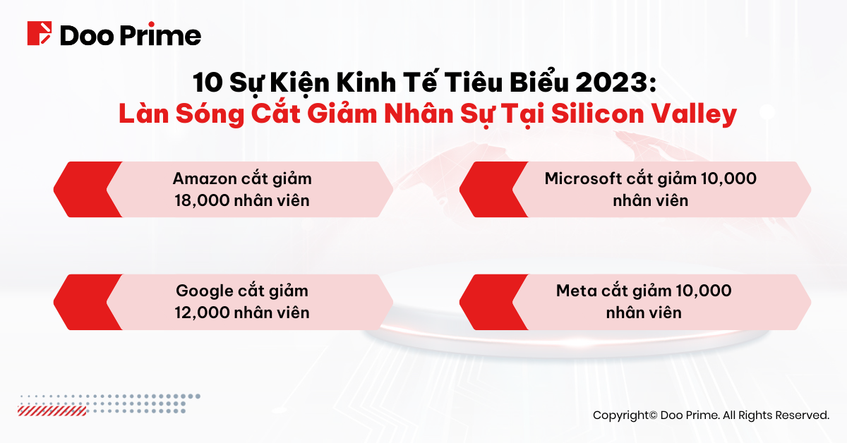 Tuy đà tăng của các cổ phiếu công nghệ là rất ấn tượng, một vài ông lớn công nghệ phải đối diện với rào cản tăng trưởng hồi đầu năm 2023. Để cắt giảm chi phí và tăng cường hiệu suất hoạt động, một vài ông lớn tại Silicon Valley đã cắt giảm một lượng lớn nhân sự của mình.