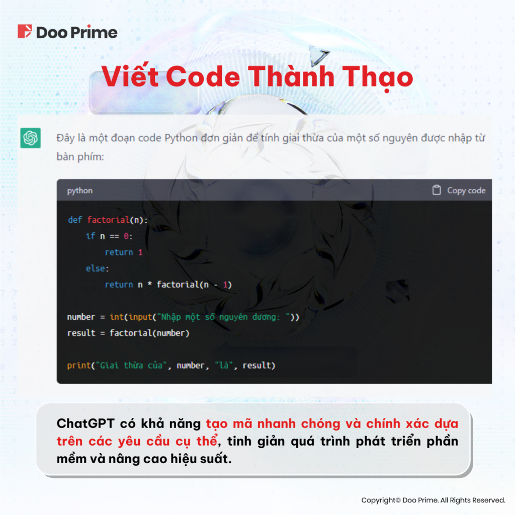 ChatGPT có khả năng tạo mã trong một khoảng thời gian ngắn dựa trên các yêu cầu cụ thể do người dùng cung cấp. Đáng chú ý, ứng dụng trên đã vượt qua bài kiểm tra L3 của Google cho vị trí kỹ sư lập trình với mức lương lên tới 180.000 USD.