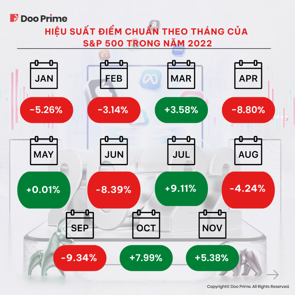 Hiệu suất của chỉ số S&P 500 liên tục dao động qua nhiều giai đoạn trong năm 2022. Trên thực tế, chỉ số S&P sở hữu mức biến động hàng tháng khá lớn, với mức dao động tăng/giảm trong ngưỡng 10%. Dưới đây là hiệu suất hàng tháng của chỉ số S&P 500 trong năm 2022: